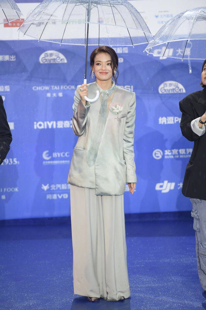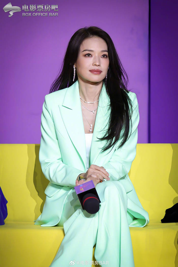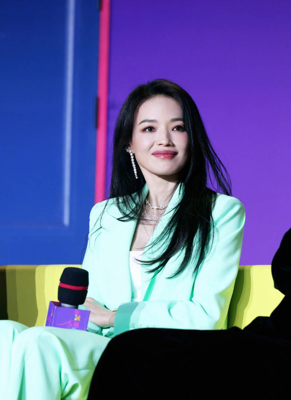 这套造型的妙处在于「反套路」。薄荷绿是公认的难驾驭色,太浅显黑、太亮俗气,但舒淇选的缎面材质自带柔光滤镜,把肤色衬得像打了三层高光。内搭的白色小背心故意往下拉了半寸,露出若隐若现的锁骨,中和了西装的正式感。最绝的是她没配常规高跟鞋,而是踩了双米白色乐福鞋,大步流星走起来带风,活脱脱把「职场女强人」穿成了「随性艺术家」。